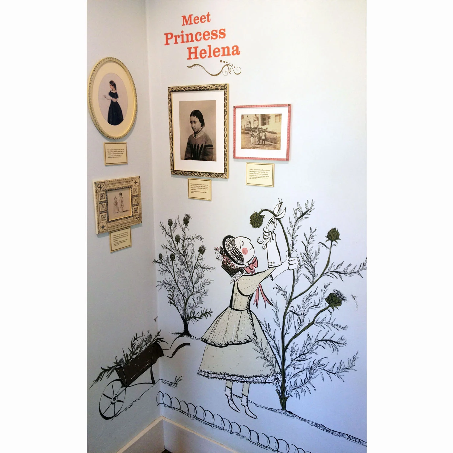 Our brief was for a four-room exhibition at Osborne’s Swiss Cottage, plus two outdoor trails covering the Royal children’s garden plots and the ‘Rhododendron Walk’ to the nearby beach. We developed an approach for the exhibition which introduced each child via an original illustrated mural telling the story of some key aspect of their personality, plus a series of photographs or family sketches of them, and an interactive; this combination included brought archive content into the display as well as varied and engaging exhibits.