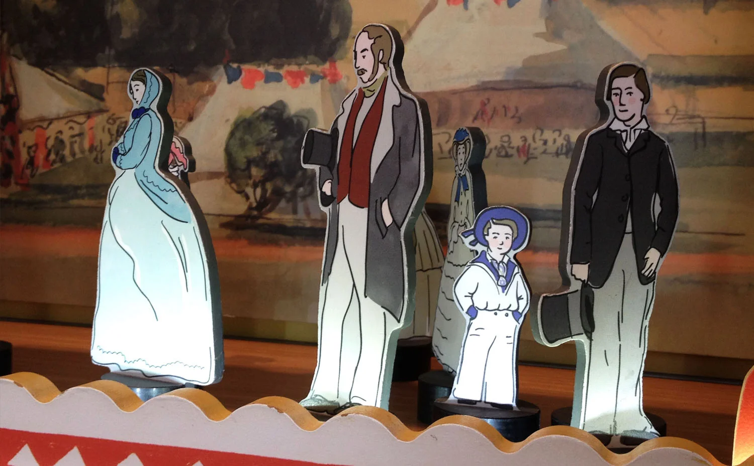 Interactives are based on simple Victorian toys such as a jigsaw, theatre, zoetrope, anamorphosis or mutoscope. Each exhibit tells a story from the archives presenting the children‘s artwork or their adventures at Osborne in their own words - drawing on letters and journals. Interpretation also threads through the dressed rooms via printed artefacts hidden in the displays. We commissioned extensive new illustrations from artist Chichi Parish. to deliver the desired quirky feel, including the illustration of a character, ‘K’, a chihuahua (referred to in the archive). K features in a trail for under 5s running through the exhibition and out into the gardens, where finding a sleeping, sculpted ‘K’ is the goal. K can be moved by the team, varying the trail for repeat visitors. Wooden wildlife carvings complete an enchanting trail to the beach, making for a fabulous family day out.